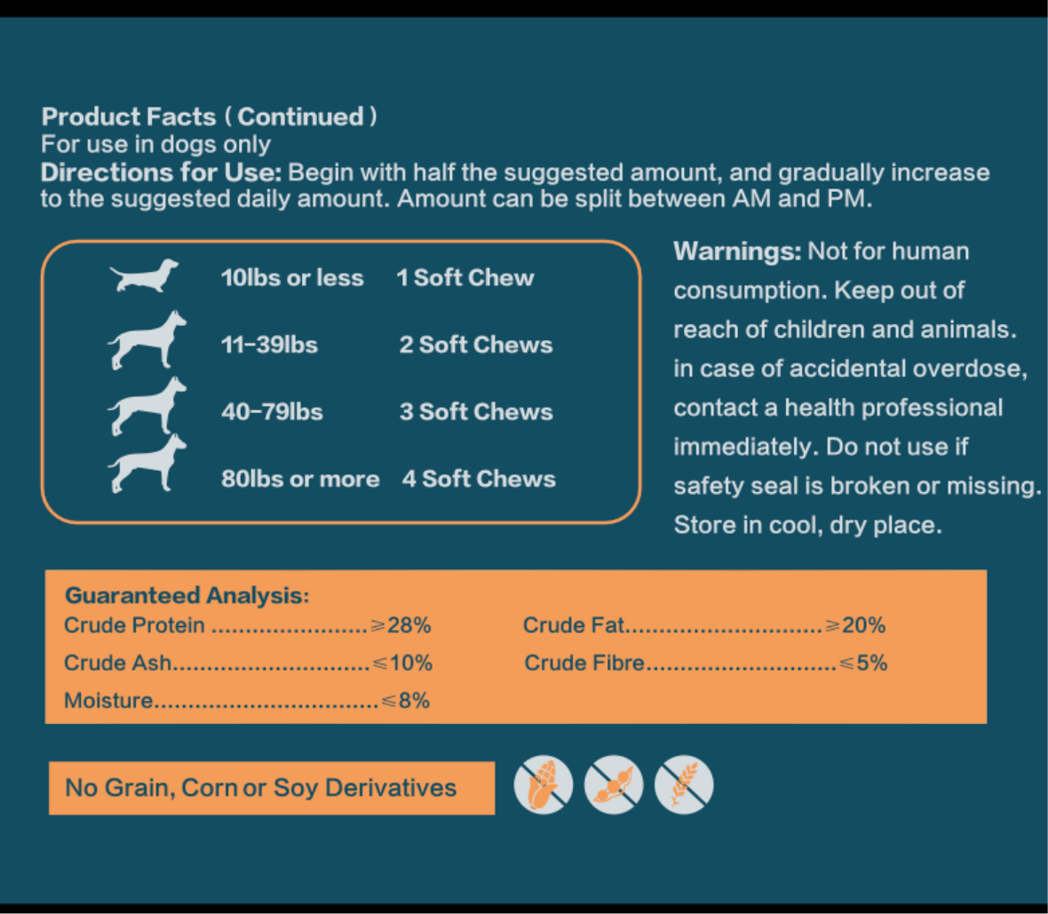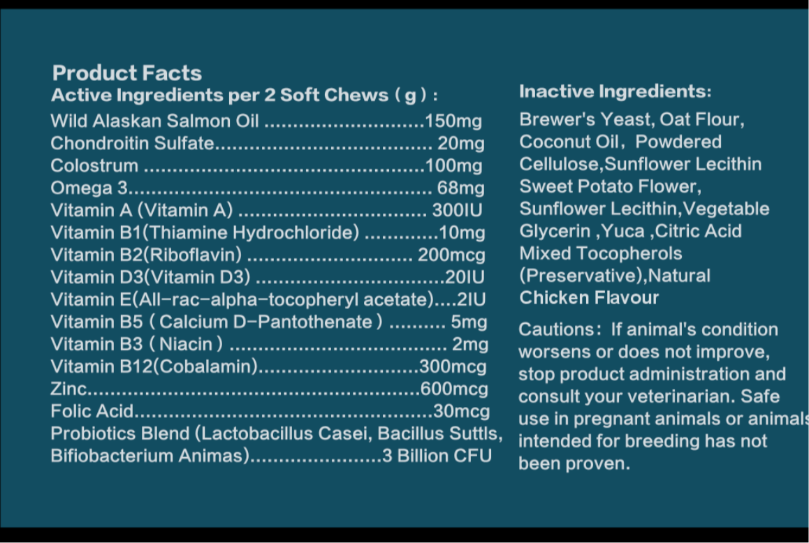 Absolutely fantastic product all totally natural my dog loves them. Been taking for 6 weeks and is malting way less coat is noticeably shinier but the best bit is they are no longer getting sore joints the day after a long walk cannot recommend these enough